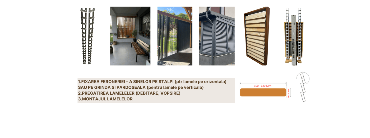 ETAPELE: FIXAREA FERONERIEI – A SINELOR PE STALPI (ptr lamele pe orizontala) SAU PE GRINDA SI PARDOSEALA (pentru lamele pe verticala) PREGATIREA LAMELELER (DEBITARE, VOPSIRE) MONTAJUL LAMELELOR