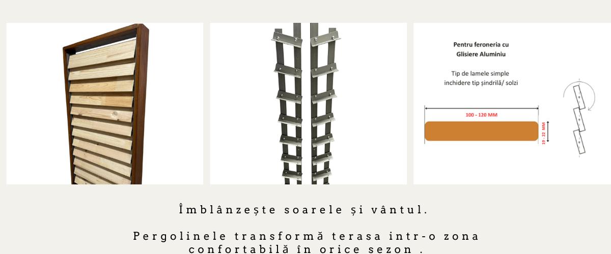 Pachetul conține sistemele de glisiere din aluminiu. Lamelele nu sunt incluse. Suruburile de inox pentru fizarea pe stalp de lemn si pentru fixarea lamelelor din lemn sunt incluse numai in cazul glisierelor antracit.